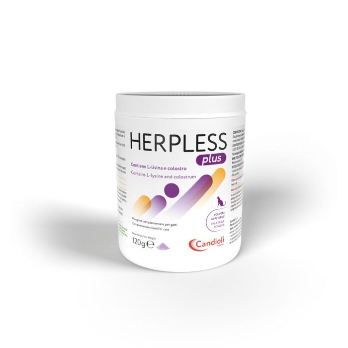 Herpless plus er et velsmagende tilskudsfoder i pulverform til katte, der kan have et øget behov for støtte af immunforsvaret. Produktet indeholder aminosyren L-Lysin, der, i den dokumenterede mængde, har vist at udfordre FHP-1 med dens replikation.
