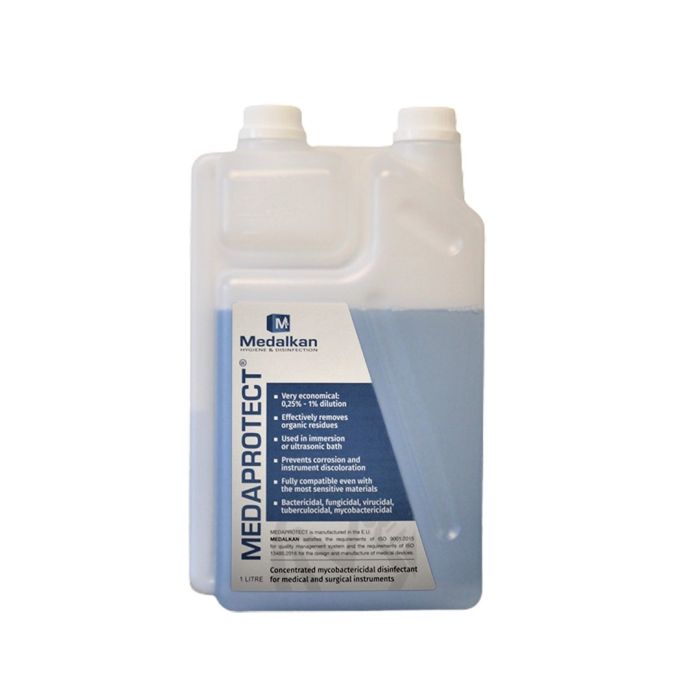 Produktet er hurtigtvirkende, sikkert i brug og meget økonomisk. En brugsklar opløsning er aktiv i op til 15 dage og kan således anvendes gang på gang. Den non-oxiderende formulering kan anvendes til alle instrumenter, der normalt forefindes i en dyrlægepraksis. Medaprotect er produceret i EU. Medaprotect fås i en flaske indeholdende 1 L med doseringstop, hvilket typisk vil svare til 100 x ”klar-til-brug” opløsninger.