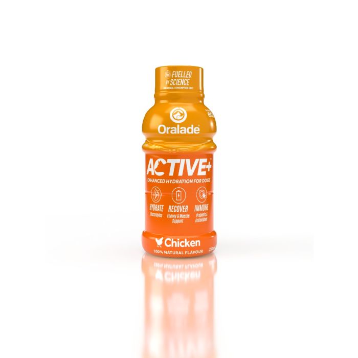 En drikkeklar sammensætning af elektrolytter, energi og L-carnitin til support af musklerne hos hunden. Oralade Active kan både bruges i forbindelse med træning, stævner og udstillinger – men også til familiehunden, der er udfordret af en varm sommer. Udfordringer med at hunden ikke drikker nok, er også ofte set – her er Oralade Active den perfekte løsning.
