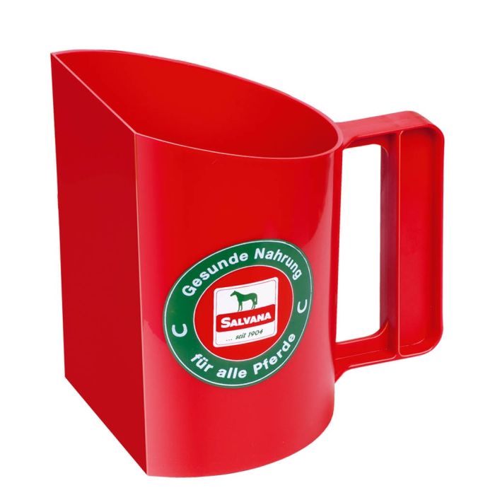Den flade side på målet gør det let at ”skovle” foder i. Der kan sættes streger på siden, til individuelle mål af foder til din hest. Et mål indeholder ca. 950 ml vand. Se også Salvana foderskovl (900150).